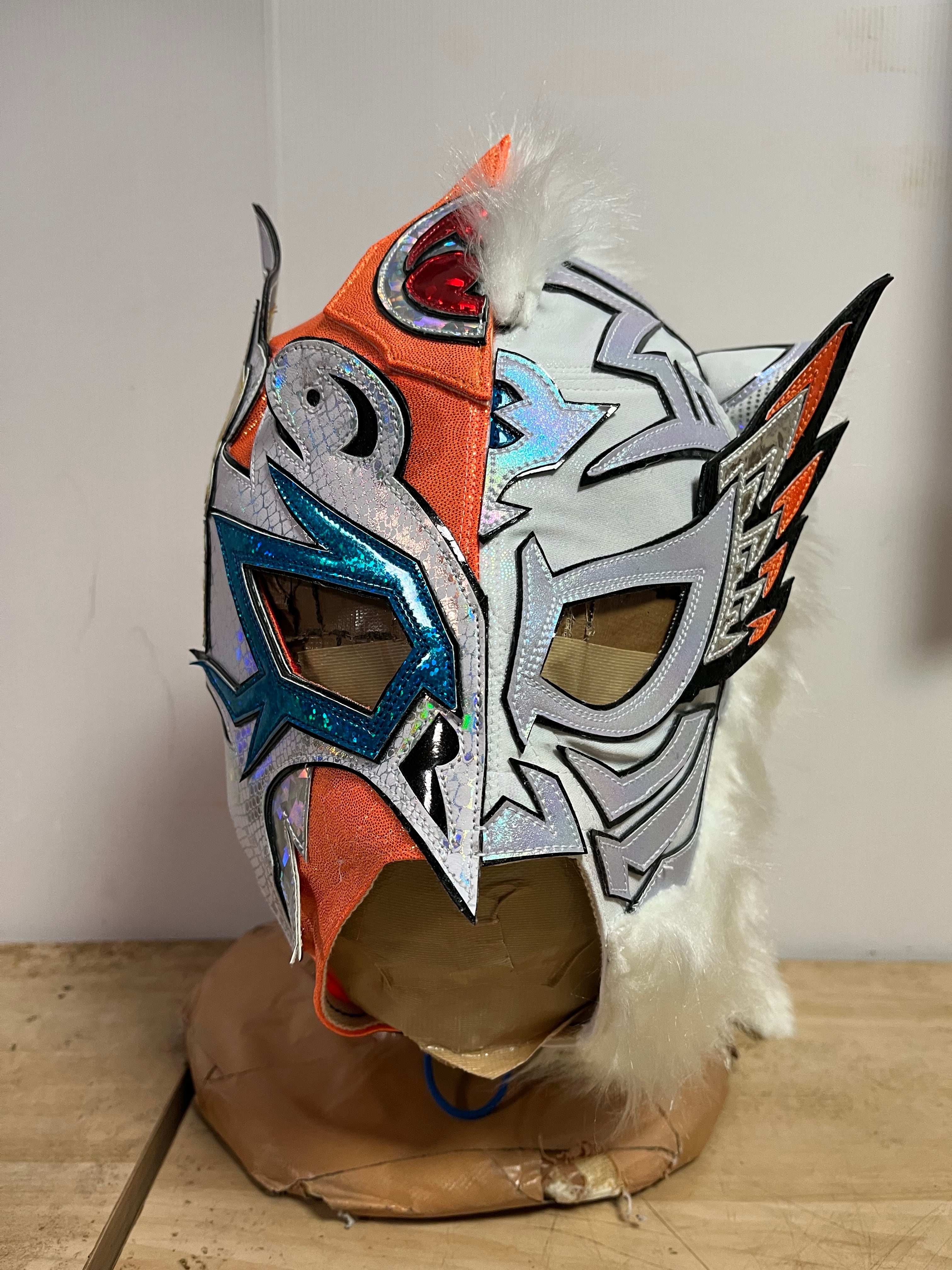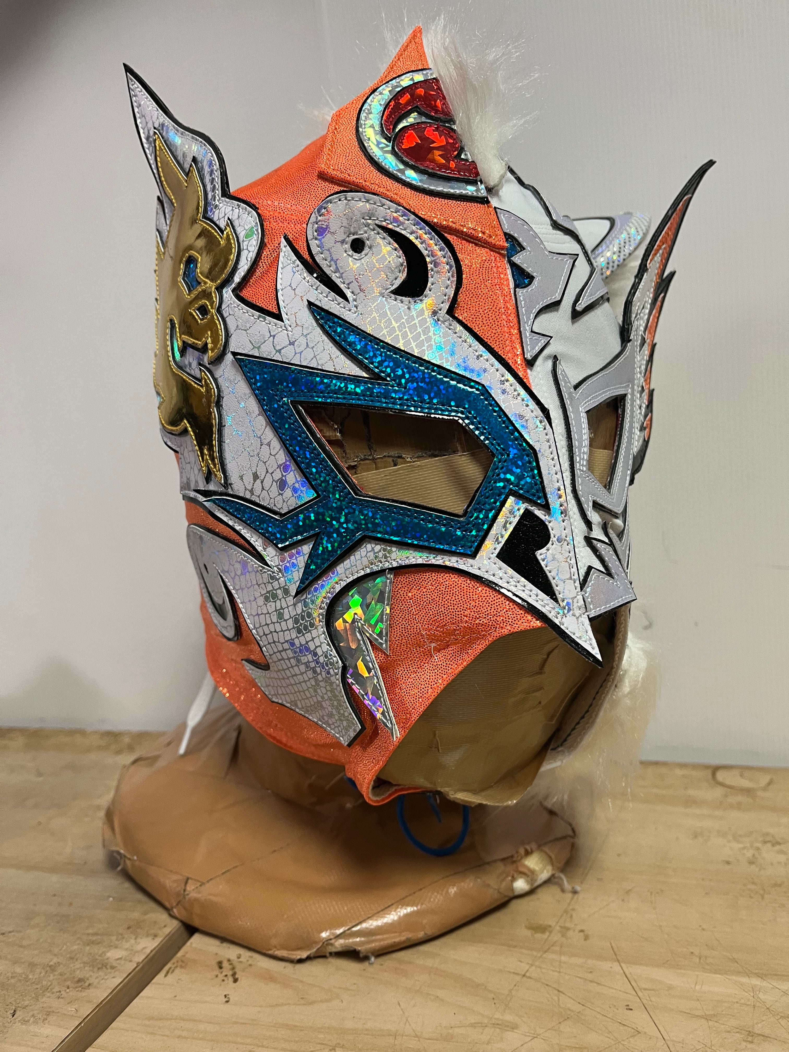 2026.3.22テンブス那覇テンブスホールにて行われた御万人王座「双琉王」選手権試合で着用したティーラン獅沙とのハーフマスク。一点ものです。